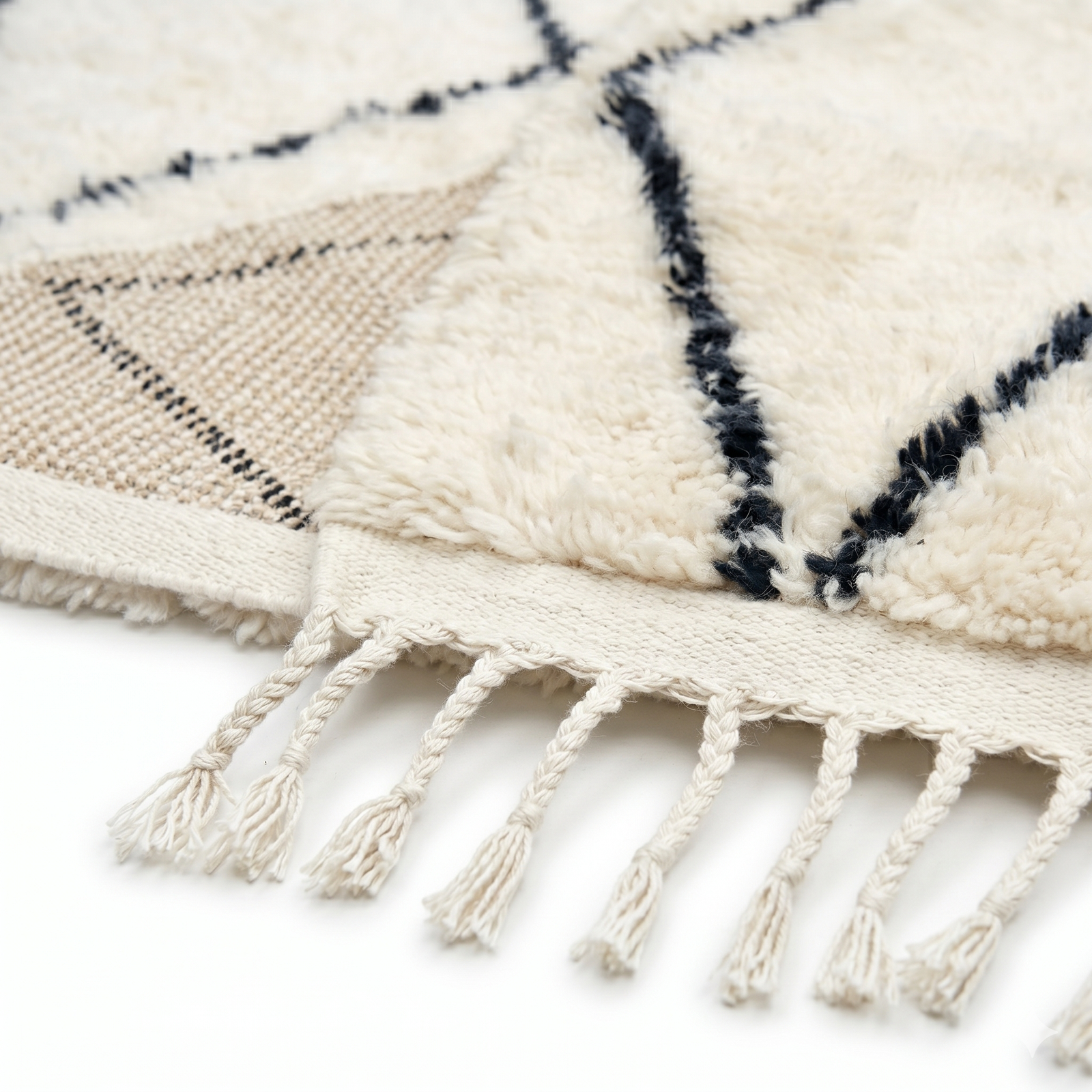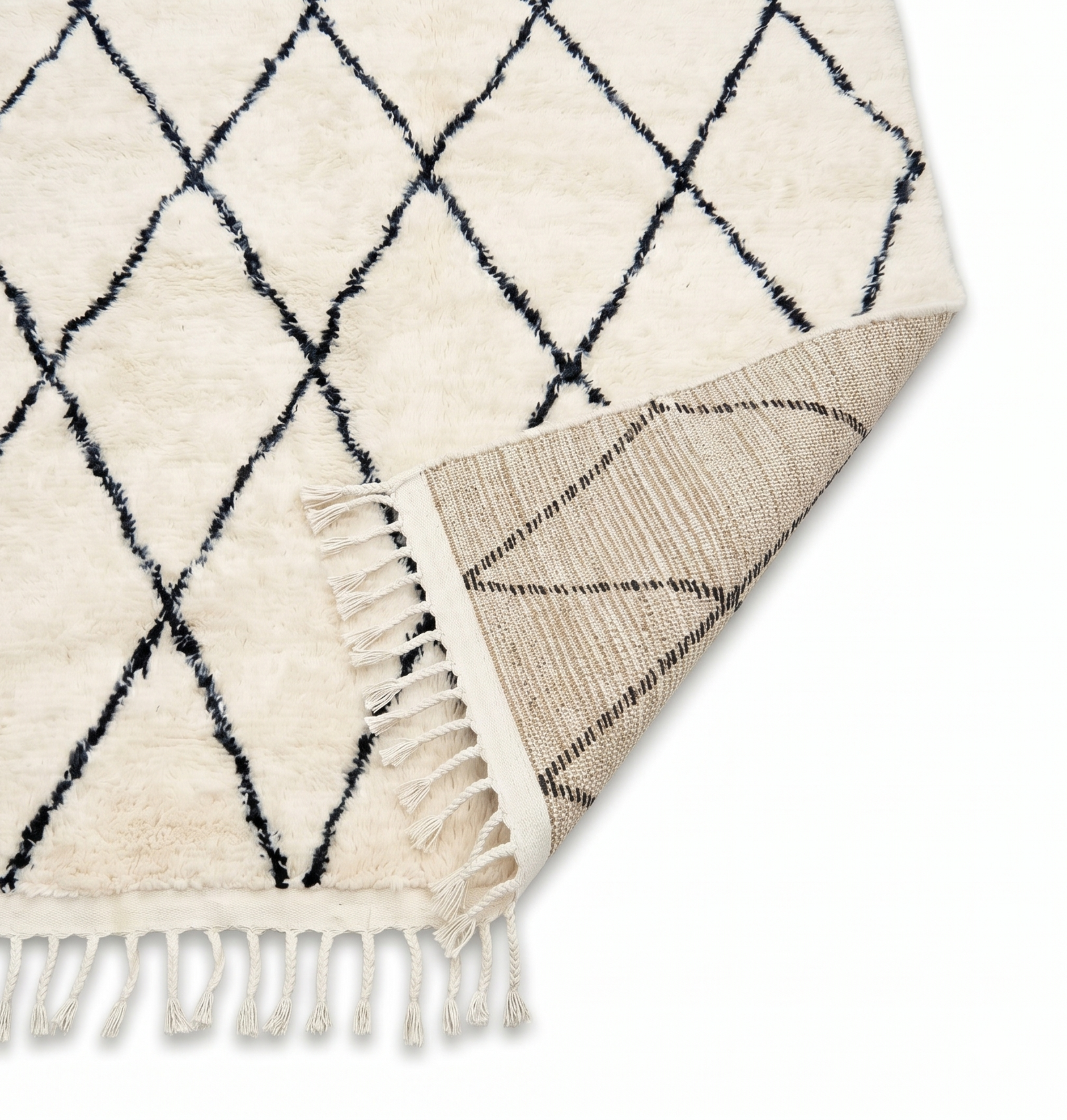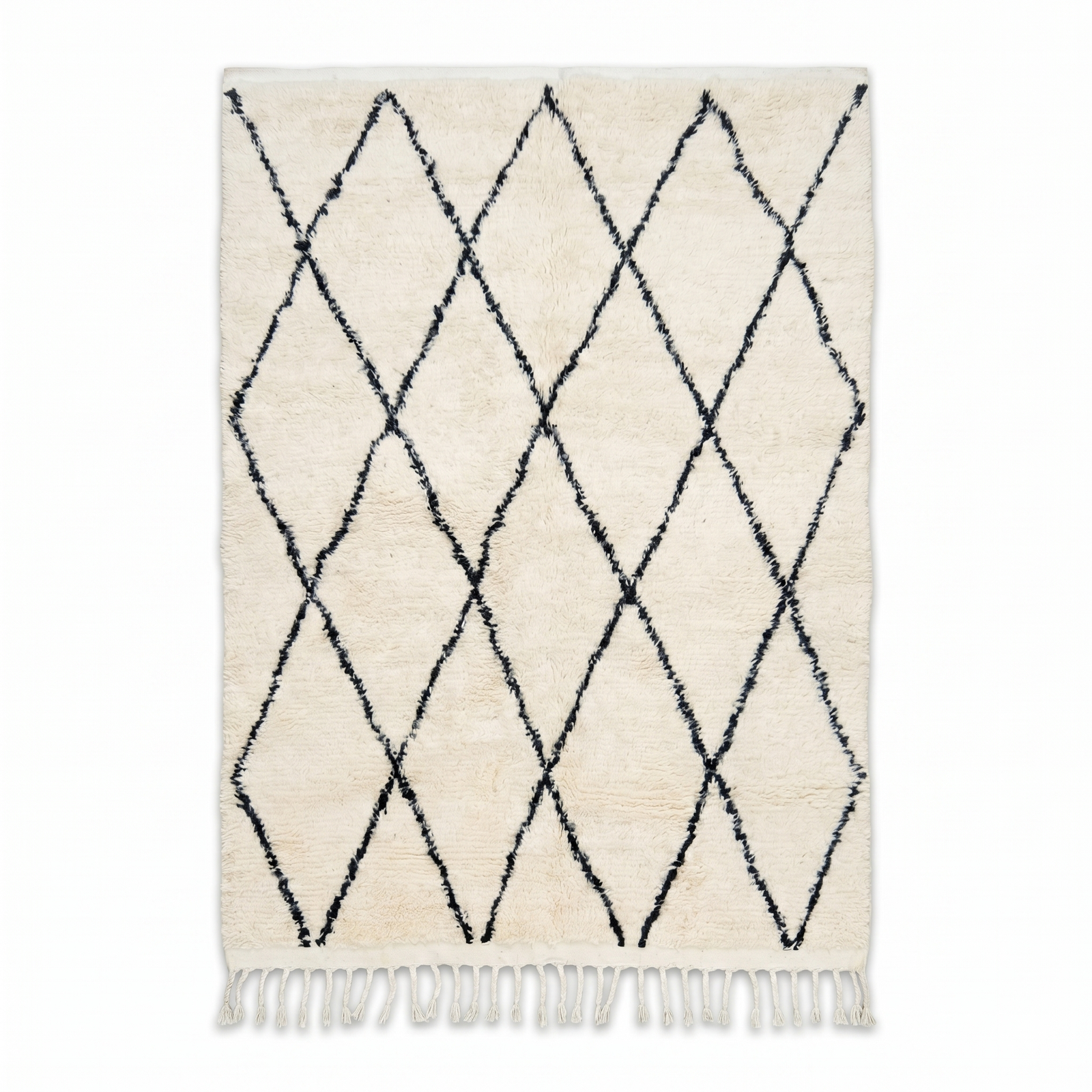This elegant piece features a delicate, continuous lattice of charcoal black diamonds woven into a lush, creamy ivory background. Crafted entirely from premium natural virgin wool, the fibers undergo an extensive washing process to achieve a signature silky sheen and ultra-plush pile. The fine, hand-knotted texture creates an exceptionally soft surface that provides ultimate comfort underfoot. Finished with classic braided fringes on one end, it perfectly balances authentic rustic charm with modern refinement.