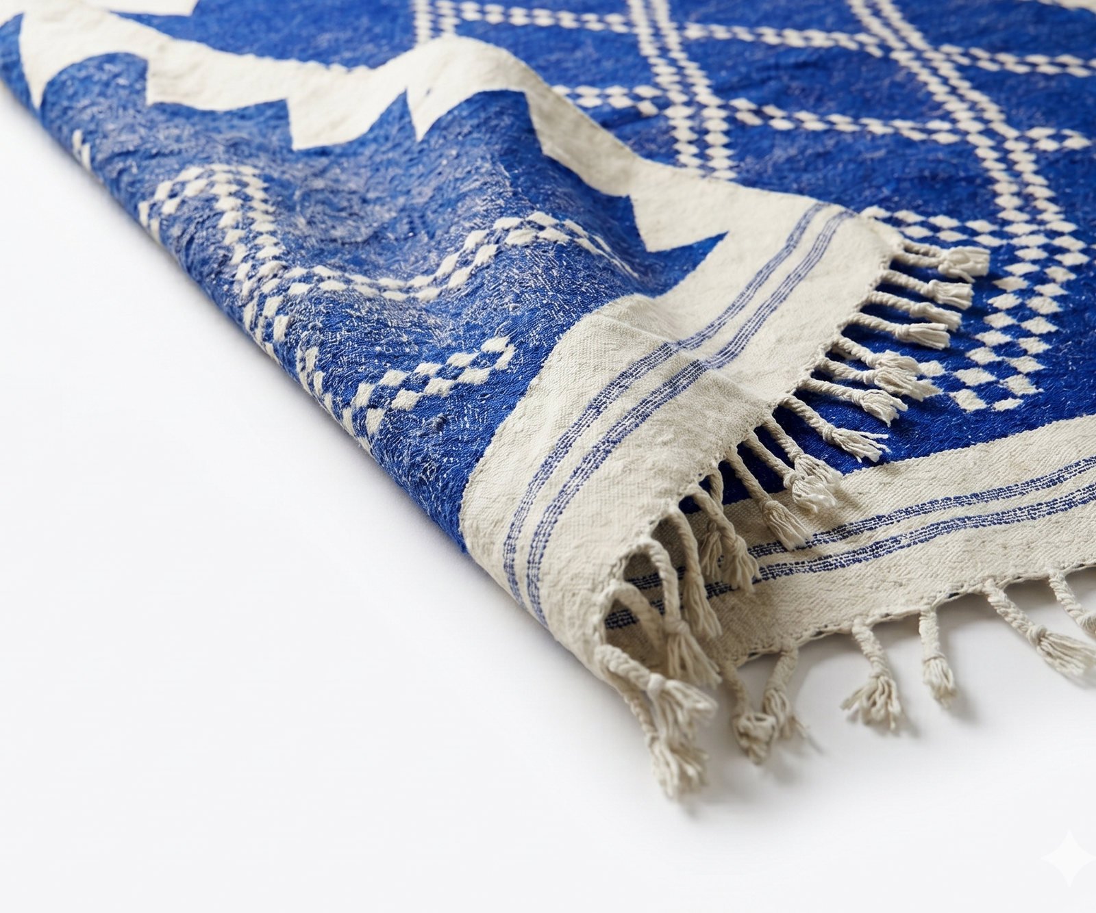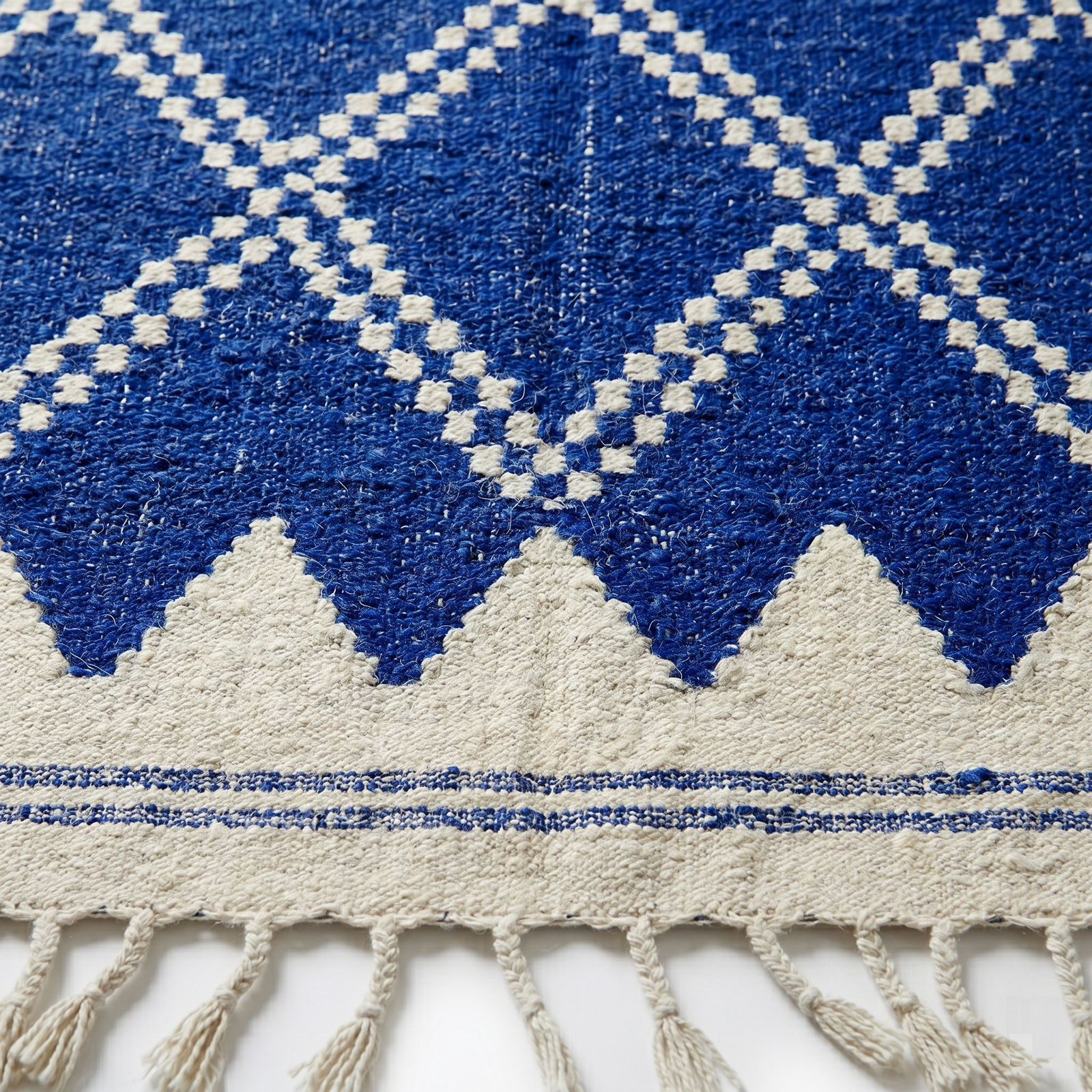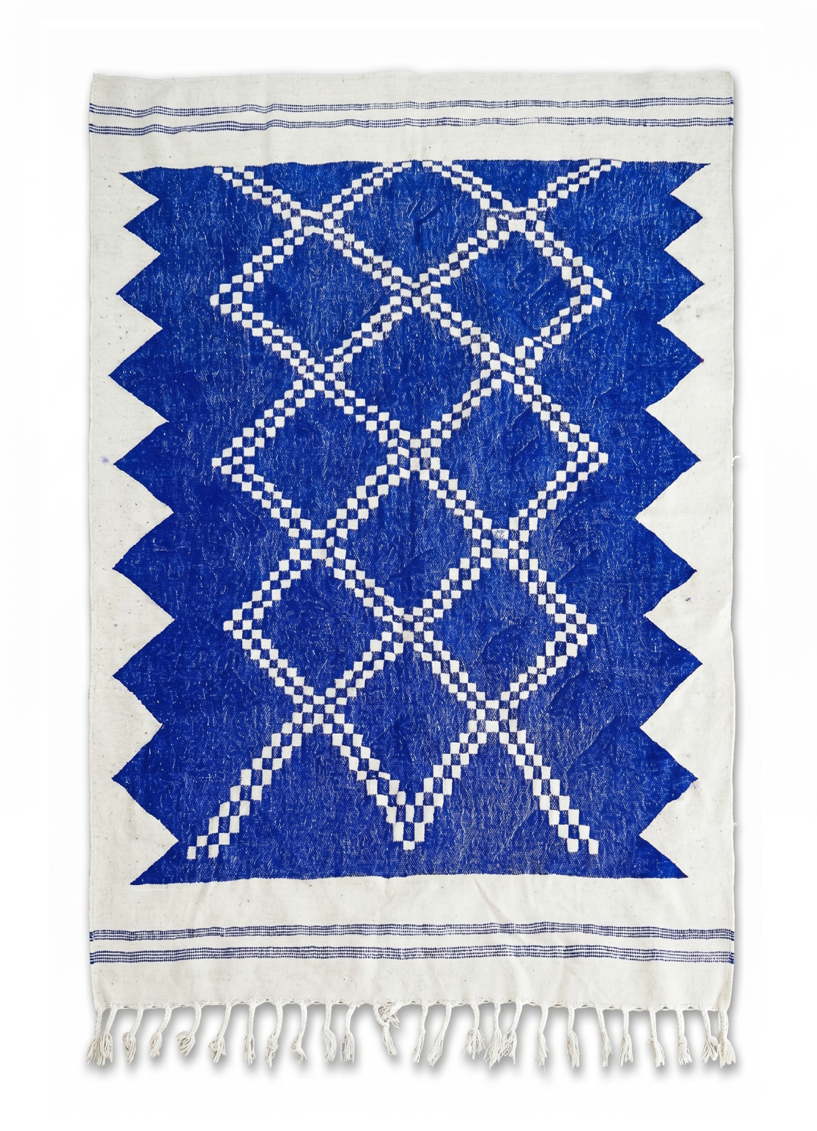 This striking Kilim features a deep, electric Majorelle blue field adorned with white pixelated diamond patterns and a bold, serrated edge design. Woven from a high-quality blend of natural wool and cotton, it offers a smooth, firm texture that is both comfortable and incredibly hard-wearing. The flatweave construction makes the pattern appear crisp and sharp, highlighting the mathematical beauty of the geometric symbols. The ends are finished with delicate hand-knotted fringes and thin indigo stripes, grounding the vibrant blue with classic artisanal details.